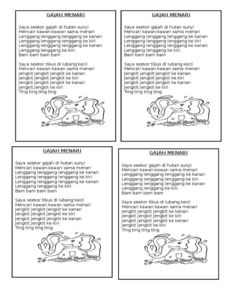 GAJAH TIKUS KATAK BURUNG Lirik Lagu Gajah Menari Saya seekor gajah Di hutan sunyi Mencari kawan-kawan Sama menari Lenggang lenggang lenggang ke kanan Lenggang. 0 0 menganggap dokumen ini bermanfaat Tandai dokumen ini sebagai bermanfaat. When autocomplete results are available use up and down arrows to review and enter to select.